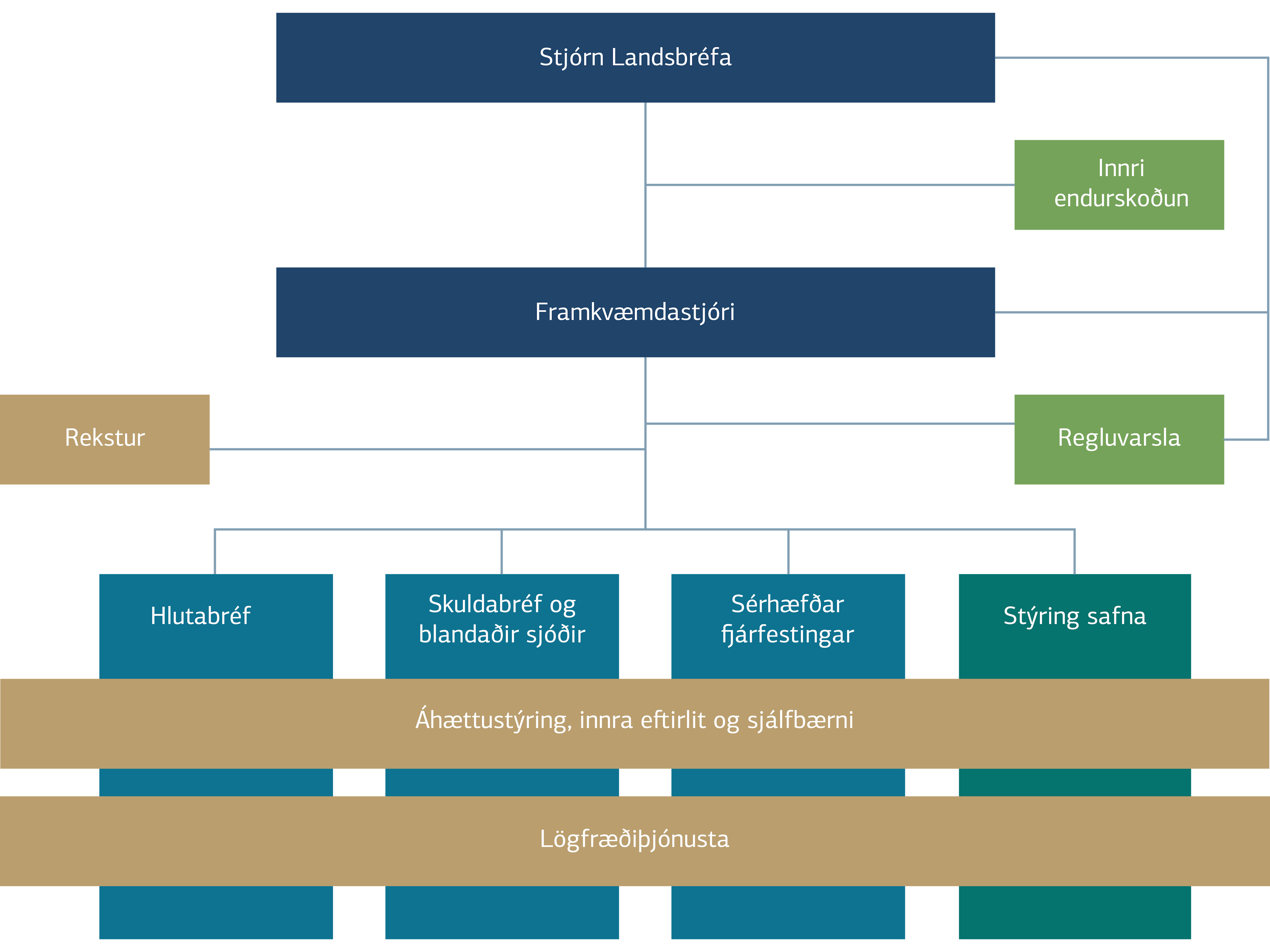 Landsbréf eru rekstrarfélag verðbréfasjóða og rekstraraðili sérhæfðra sjóða, en auk sjóðastýringar hefur félagið starfsleyfi til að sinna eignastýringu og fjárfestingaráðgjöf og er sú starfsemi nefnd Stýring safna í skipuriti og er aðskilin frá sjóðastýringu. Sjóðastýringin skiptist í þrjár einingar þ.e. hlutabréf, skuldabréf og blandaða sjóði og svo sérhæfðar fjárfestingar. Þvert á þessar einingar eru síðan lögfræðiþjónusta og áhættustýring , en þessar einingar vinna náið bæði með sjóðastýringu og stýringu safna. Undir áhættustýringu telst jafnframt innra eftirlit og sjálfbærni. Innri endurskoðun og regluvörslu er sinnt af Landsbankanum samkvæmt sérstökum útvistunarsamningum. Stjórn Landsbréfa er skipuð þremur einstaklingum og eru þeir allir óháðir bæði Landsbréfum og móðurfélaginu Landsbankanum.